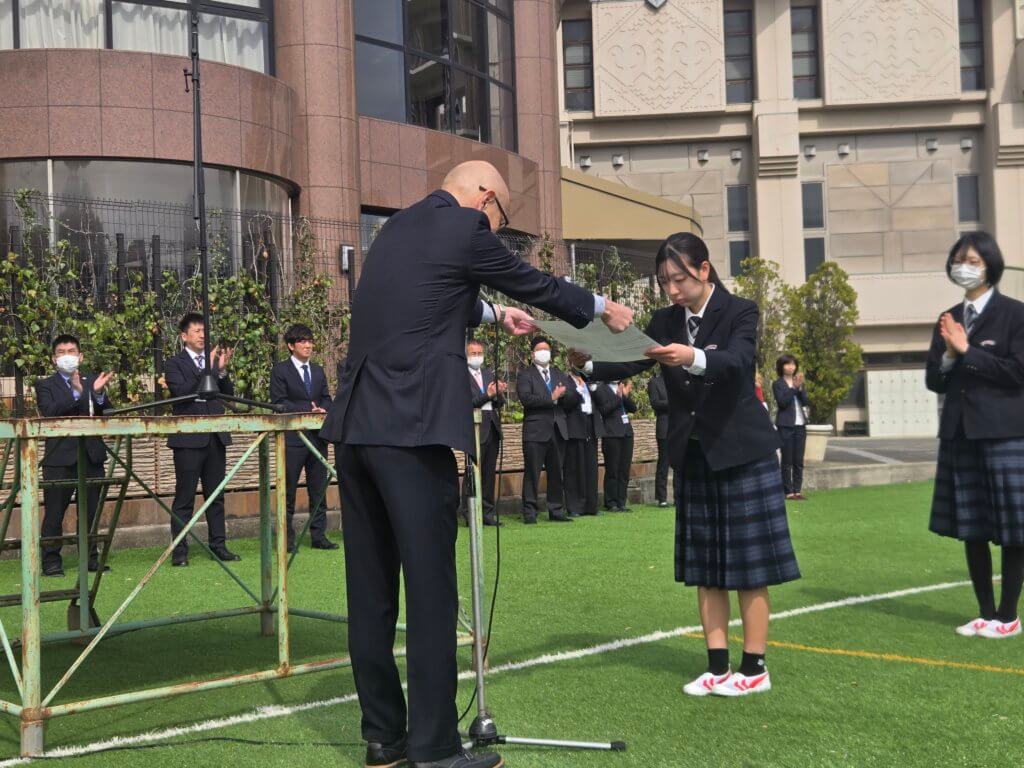 日頃の頑張りである英検合格者や全国個人3位の日本拳法部、ブロック大会優勝したテニス部を伝達表彰しました。